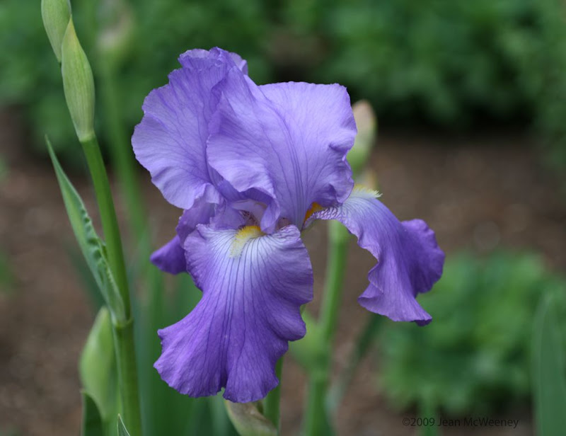 My Madame Alfred Carriere climbing rose is still blooming away along with my Carnaby clematis (climbing up the rose trellis) and some white bearded iris. I can't wait for my standard Nanho Purple Butterfly Bush, Buddleia davidii ‘Nanho Purple’, to start blooming. That's it in the pot.