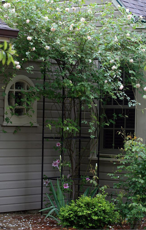 Madame Alfred Carriere, a Noisette rose, was developed sometime in the 1800's. It has a lovely Tea rose fragrance and was the first rose planted at Sissinghurst garden by Vita Sackville-West. The plant has only been here for two growing seasons, although it was a gift from a friend's too shady garden, so maybe it is three years old. It grew very rapidly and as you can see, it's really a bit tall for the trellis and the house. It's going to require some pruning and training after its initial bloom this year so that it's more clear of the windows. Although it gets blackspot every so often, I think that's because of its location in a corner. Other than that it's extremely hardy and I would highly recommend it for a more open space!